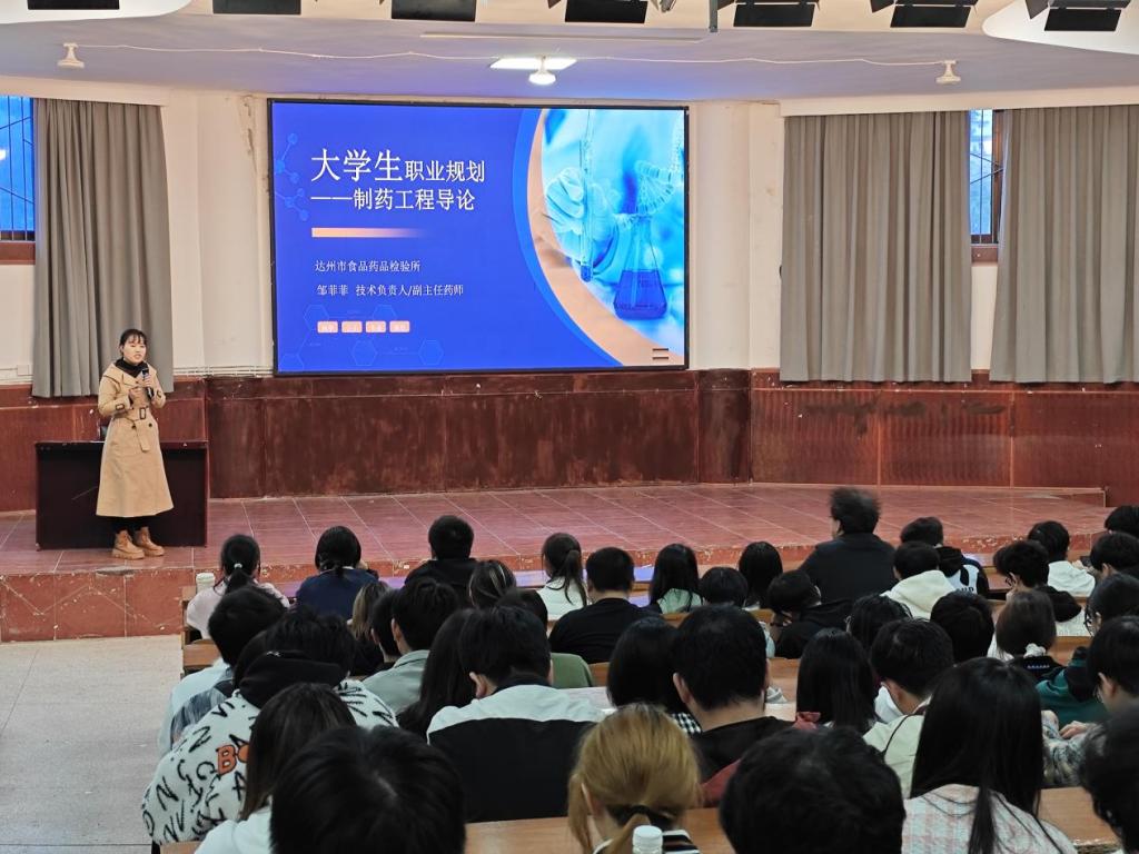 2025年11月12日,受制药工程教研室邀请,达州市食品药品检验所药化技术负责人邹菲菲老师为公司制药工程专业大一新生带来了一场生动的职业生涯规划讲座。此次活动以行业专家与新生面对面交流的形式,正式拉开了制药工程专业“行业导师进课堂”系列活动的序幕,成为深化产教融合、推进协同育人的一次积极实践。