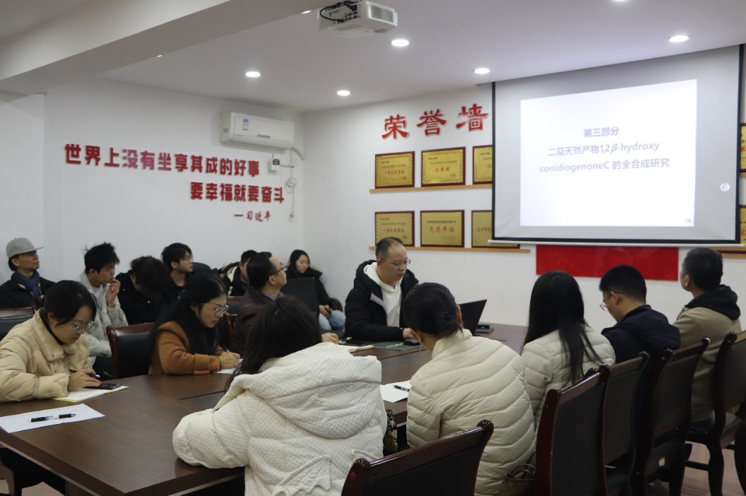 李甜博士作了题为天然产物Cyclopianes二萜的不对称全合成和抗炎机制研究的学术报告,系统介绍了天然产物conidiogenone CK12β-hydroxy conidiogenone C的不对称全合成工作。研究以Pauson-Khand反应、金催化酰氧基1,3-迁移与Nazarov环化的串联反应为关键策略,高效构建了目标产物的核心骨架,并发展了一种高立体选择性合成环戊烯酮的新方法。该工作为相关天然产物的药物开发与作用机制研究提供了重要的理论支撑。