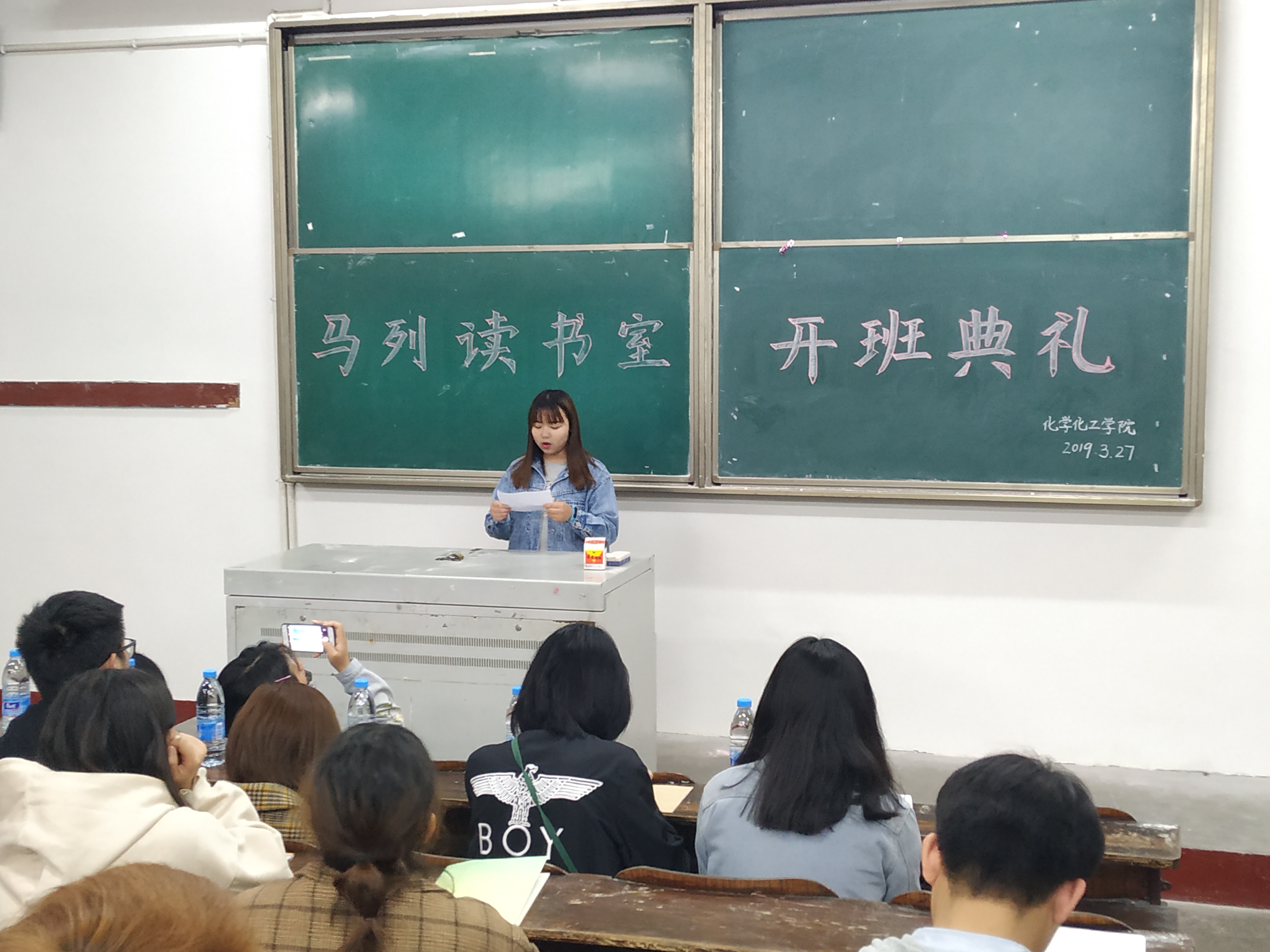 开班典礼上,团总支第二副书记王曦对马列读书室的基本情况进行了介绍,她指出人生是一个不断提升自我的过程,需要在实践中思考、交流中学习、未知中探索,她希望所有学员能够珍惜在马列读书室的机会,努力学习党的理论,把自己培养成文理交融的优秀老员工。随后,上一届优秀学员进行了发言,她分享了自己在马列读书室所学到的知识并发表了自己的感想,同时鼓励新一届马列读书室成员努力学习;新学员代表也表达了自己对马列读书室学习的期待,表示会严格要求自己,把握住时间和机会,向优秀学员学习。最后,马列部部长彭雯对本次开班典礼做了总结发言,对新学员提出了马列读书室课堂的相关要求,强调了马列课笔记与考核成绩相关方面的注意事项,希望同学们在本期的马列课上学有所获,学有所成。