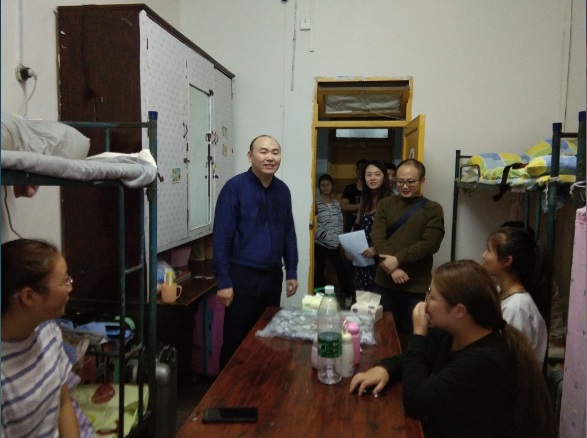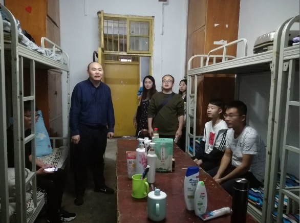 2018年9月13日晚,公司党总支副书记屈川、学工办主任彭波、辅导员张魏霞率领部分团学干部走访2018级新生寝室。