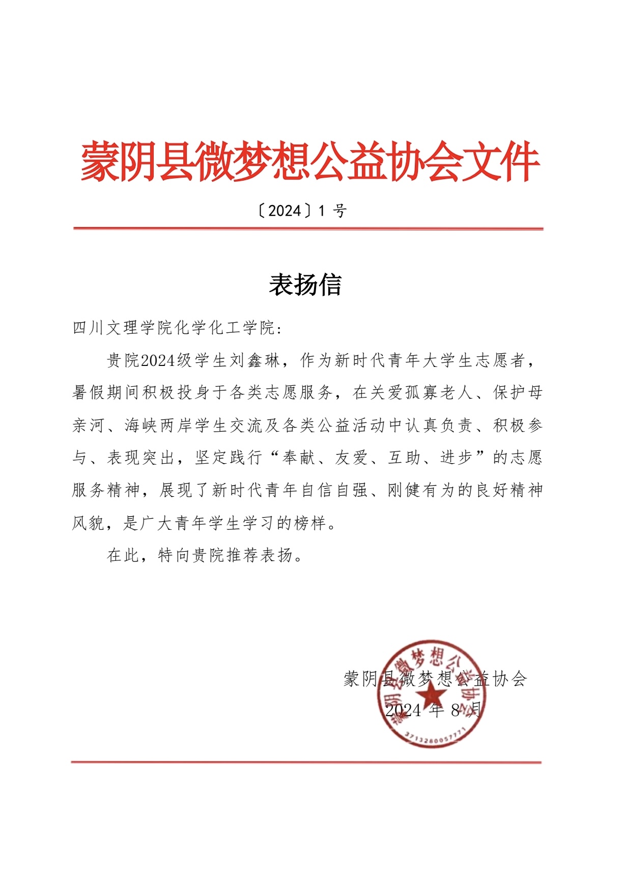 bw西汉姆联2024级员工刘鑫琳获蒙阴县微梦根公益协会表扬信