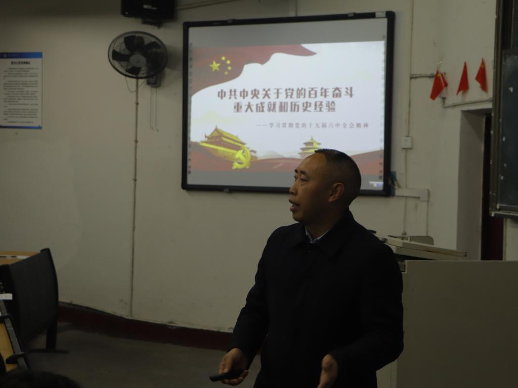涂德祥首先讲述了中国共产党百年党史中形成的三个决议的特殊时代背景和深远历史意义,强调了党的百年奋斗历程波澜壮阔,时间跨度长,涉及范围广,需要研究的问题多。要按照总结历史、把握规律、坚定信心、走向未来的要求,把党走过的光辉历程总结好,把党团结带领人民取得的辉煌成就总结好,把党推进革命、建设、改革的宝贵经验总结好,把党的十八大以来党和国家事业砥砺奋进的理论和实践总结好。然后围绕“一个历史定位、两个确立、三次理论飞跃、四个历史时期和伟大成就、五大历史意义、十个方面宝贵经验”六个主题结合大量的史料和数据为师生们详细阐释了党的百年奋斗重大成就和历史经验。最后他要求大家提高政治站位,努力做到两个维护,为迎接党的二十大的胜利召开,大家都要继往开来踏上新的赶考路。