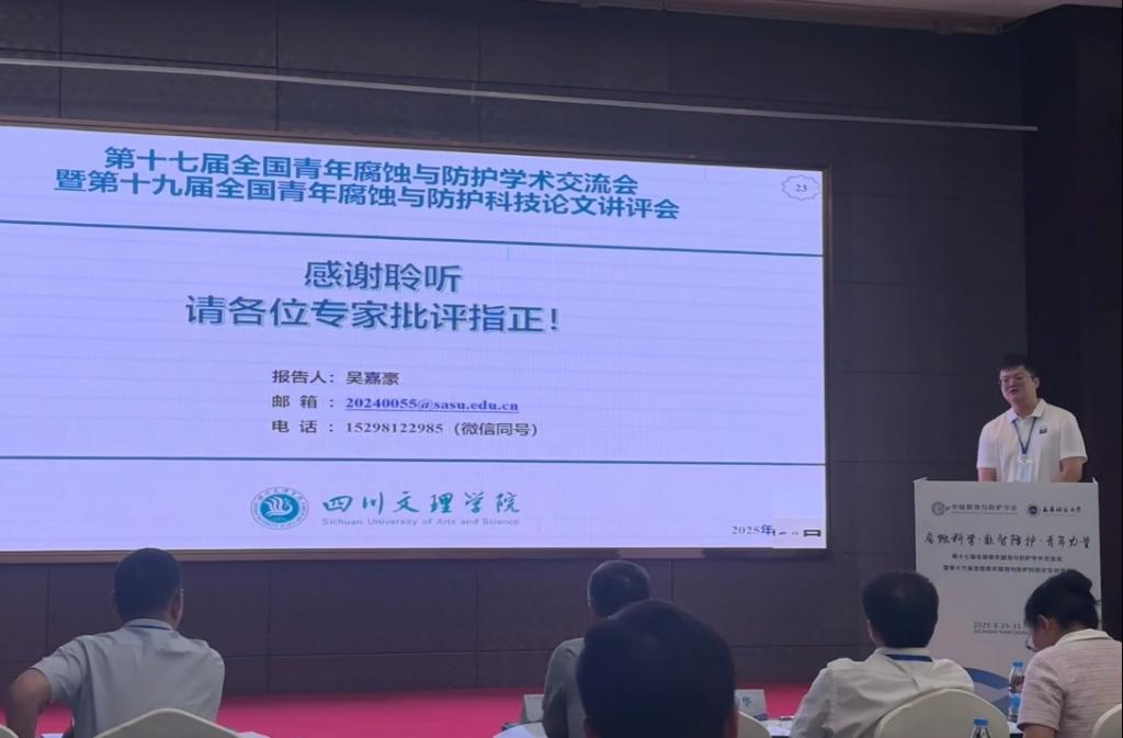 8月29日至31日,bw西汉姆联教师吴嘉豪博士参加了在四川省南充市举办的“第十七届全国青年腐蚀与防护学术交流会暨第十九届全国青年腐蚀与防护科技论文讲评会”。