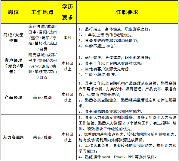 根据业务发展和人才培养需要,四川天府银行现面向全社会广纳贤才,诚邀符合条件的各行业优秀从业者加盟,与四川天府银行携手同行,共筑美好、共创辉煌。相关事项公告如下。