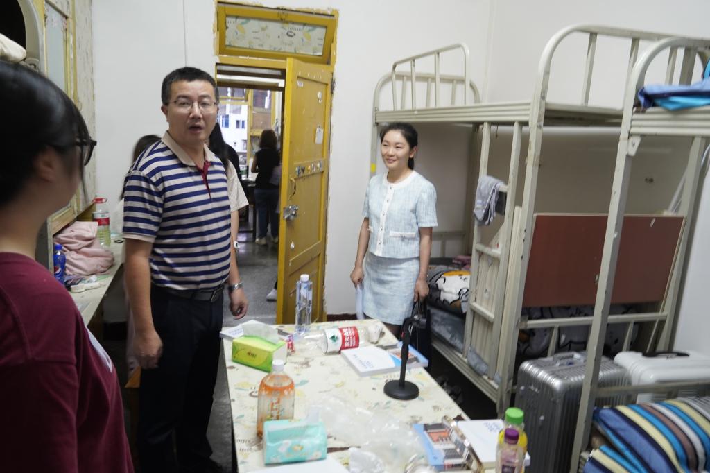 潘书记和向经理各带一组老师,分别走访了全院全部新生寝室。他们对新生们的到来表示热烈的欢迎,亲切询问大家来自哪里、对宿舍条件是否满意、入学以来适应程度、未来规划等。老师们给同学们提出了一些安全注意事项,提醒同学们安全用电,保持宿舍卫生,营造一个安全、干净、整洁的宿舍环境。叮嘱大家要提高安全防范意识,确保人身财产安全,谨防诈骗,同时希望大家能够互相包容、互相学习,增进对彼此地域文化的了解,从而营造积极向上的良好宿舍氛围。